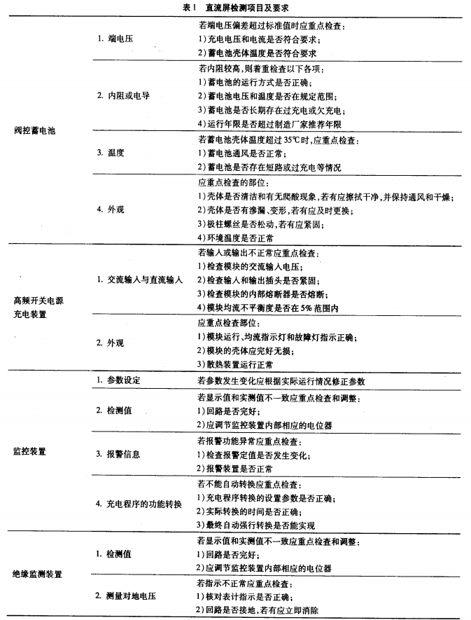 在建立完善的點檢制度之前,首要必須制定契合現(xiàn)場要求,并可以作為依據(jù)的設(shè)備檢修標準。在直流屏標準中規(guī)則了直流電源體系設(shè)備檢修的基本要求,檢修前的準備、檢測項目、充放電試驗等內(nèi)容。直流屏主要由蓄電池.高頻開關(guān)電源充電設(shè)備,監(jiān)控設(shè)備、絕緣監(jiān)測設(shè)備4部分組成,見表1。
