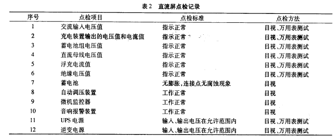 首要需求編制點檢規(guī)范,編制出符合實際出產(chǎn)需求的點檢規(guī)范,使其他點檢者能快速、簡潔執(zhí)行點檢規(guī)范。點檢規(guī)范的內(nèi)容觸及方面比較多,列入點檢辦理規(guī)模的部位也比較多,例如直流屏,溝通輸入電壓值、充電裝置輸出的電壓值和電流值、蓄電池組電壓值、直流母線電壓值、浮充電流值、絕緣電壓值、蓄電池、自動調(diào)壓裝置、微機監(jiān)控器、音響報警裝置、UPS電源、逆變電源等都是關(guān)系到直流屏安全運轉(zhuǎn)的重要參數(shù)及裝置,確定為點檢部位。點檢部位確定后,就要落實點檢內(nèi)容,點檢辦法目前還是以簡單東西、儀器和人的感觀為主的點檢辦法。因而,點檢內(nèi)容首要是查看設(shè)備溫度、電壓、表計指示、工作狀況等方面參數(shù)。直流屏設(shè)備點檢工作首要是以日常點檢為主,定時點檢為輔。日常點檢首要以人的感官為主,經(jīng)過聽、摸、看.擰等辦法對運轉(zhuǎn)中的設(shè)備進行一個外觀的查看。經(jīng)過每日進行的點檢工作,及時發(fā)現(xiàn)設(shè)備存在的危險并消除,使設(shè)備長周期安全運轉(zhuǎn)。由于直流屏的特殊性,展開的直流屏設(shè)備專業(yè)點檢也很重要,點檢辦法以工用具、外表和人的感觀為主的點檢辦法。經(jīng)過定時進行的點檢工作,及時發(fā)現(xiàn)設(shè)備存在的危險并消除,使設(shè)備長周期安全運轉(zhuǎn),見表2。