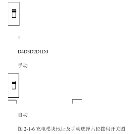 模塊面板上嵌入的電位器用來調整模塊在手動狀態(tài)下的輸出電壓,注意只有在手動方式下,調節(jié)該電位器才起作用。充電模塊地址及手動/自動撥碼開關用來設置模塊通訊地址和選擇手動功能,其定義如圖2-1-6所示: